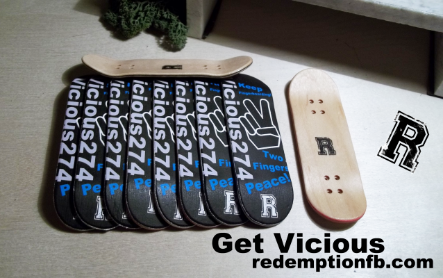 Vicious graphics are available now at Redemption! The graphic looks really sick. Its simple, but fully works at the same time, and it reads the catch phrase of one of the most passionate fingerboarders on the planet. He's a great member of the Redemption team! So thats great thing one, the graphic. Great thing two? They're printed on MMC decks, except now they're 99mm long mmc decks, which is slightly shorter than before. All in all, one of the best shapes I've tried (seriously, if you've not used MMCs, do it. They might look a bit weird, but they perform soo good!), and now they're 99 long, just brings an all round awesome deck.